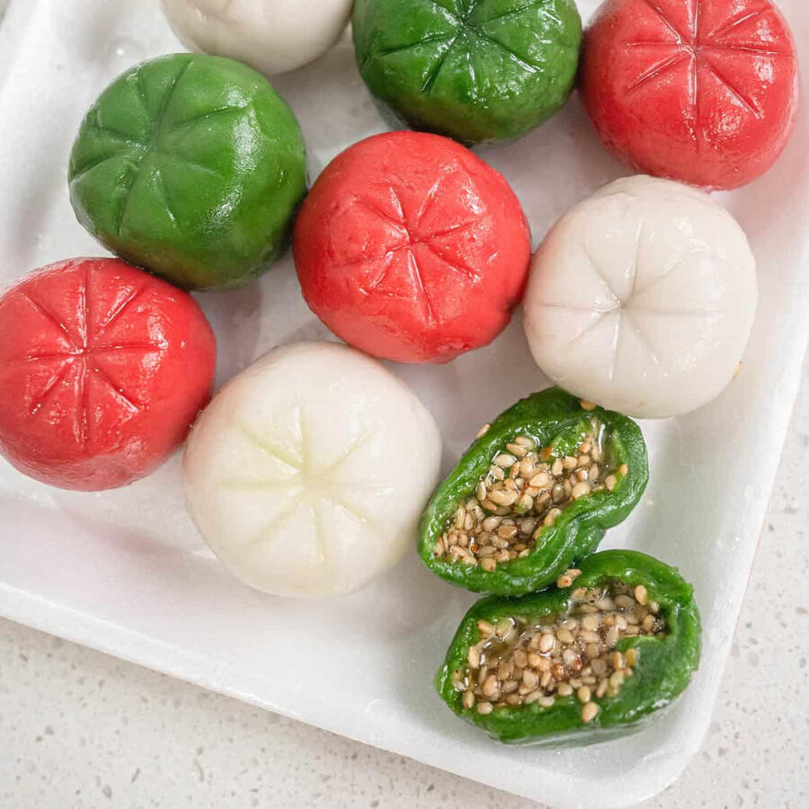 Honeyed Rice Cakes- Soft and colorful ball shaped cakes filled with honey, brown sugar and toasted sesame seeds.10,000gil