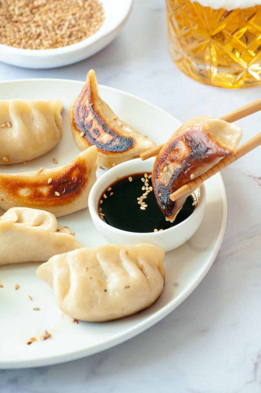 Gyoza- Savory pan fried dumplings, stuffed with minced pork, cabbage, garlic and ginger. ginger sesame soysauce on the side for dipping.15,000gil
